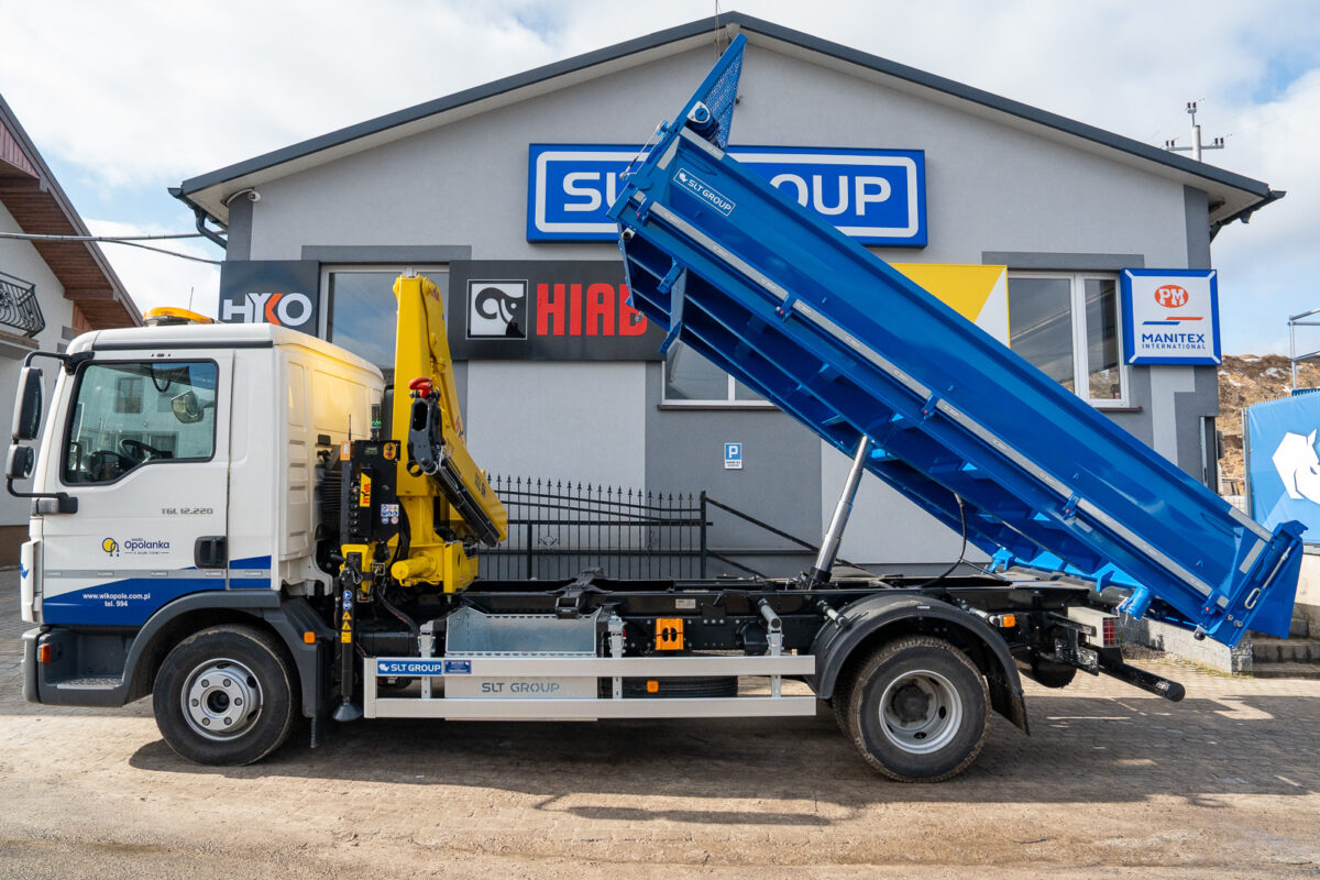 Na podwoziu MAN TGL 12.220 4×2 zrealizowaliśmy wielofunkcyjną zabudowę wyposażoną w wywrotkę trójstronną (3W) oraz żuraw przeładunkowy HYVA HB70X E3.